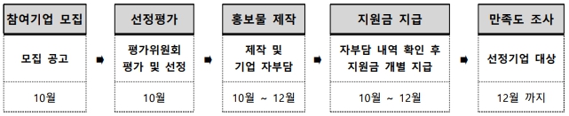 ㅇ (지원방법) 선정평가를 통한 지원기업 선정 후 홍보물 제작 진행 및 총 소요비용 기업 先 자부담 後 지원금 지급