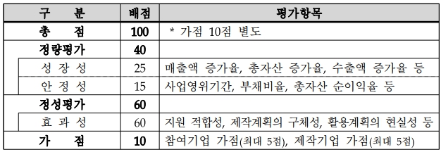 ㅇ (평가기준) 정량평가(40점) + 정성평가(60점) + 가점(10점)